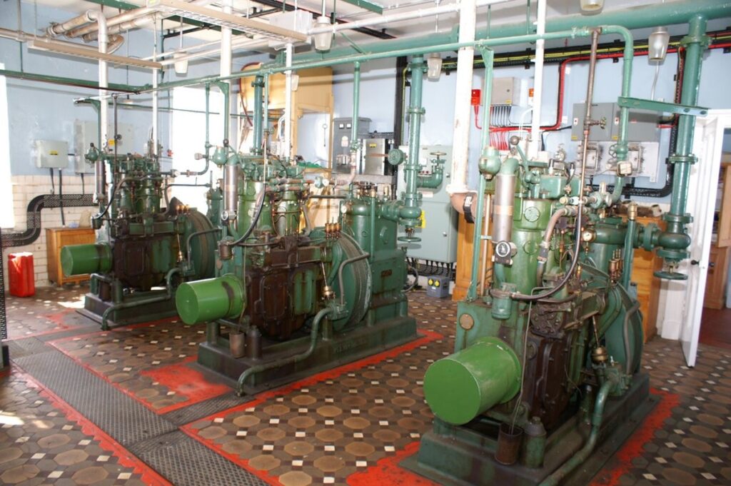 Three Kelvin K2 Diesel Engines produce the compressed air necessary to sound the Foghorn. The engines are now running again after 30 years of remaining silent.