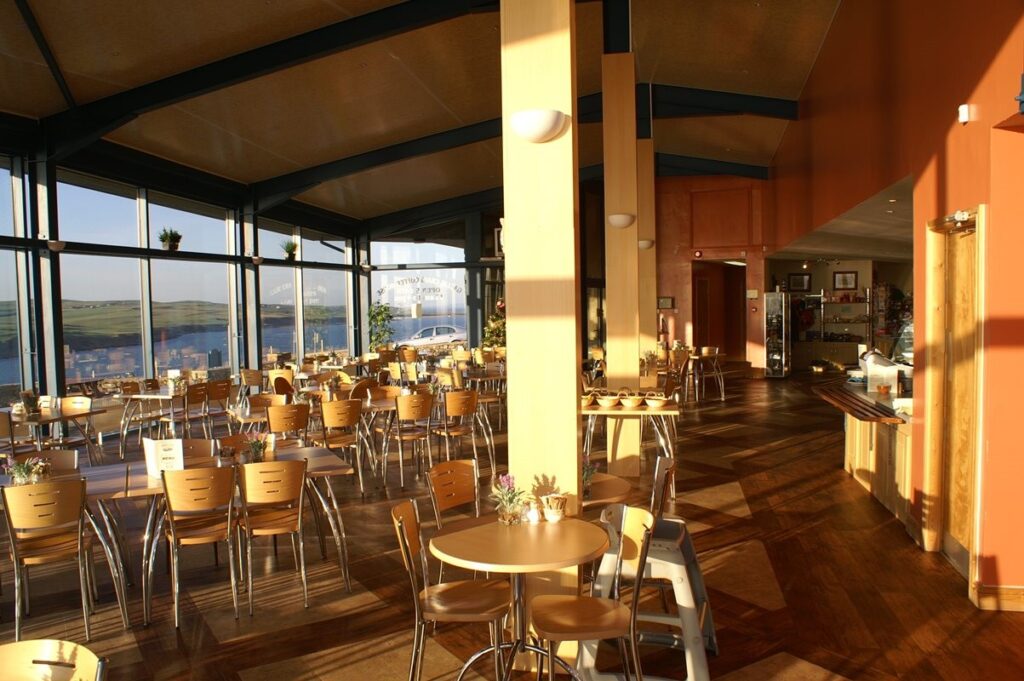 Gallie Craig Coffee House was named after the ragged rock of the same name protruding from the sea south of the Mull of Galloway. The glass encased coffee house and its terrace look towards the rock and the spectacular panoramic view also takes in the Lighthouse, the Isle of Man, Ireland, the South Rhins Peninsula and Luce Bay.